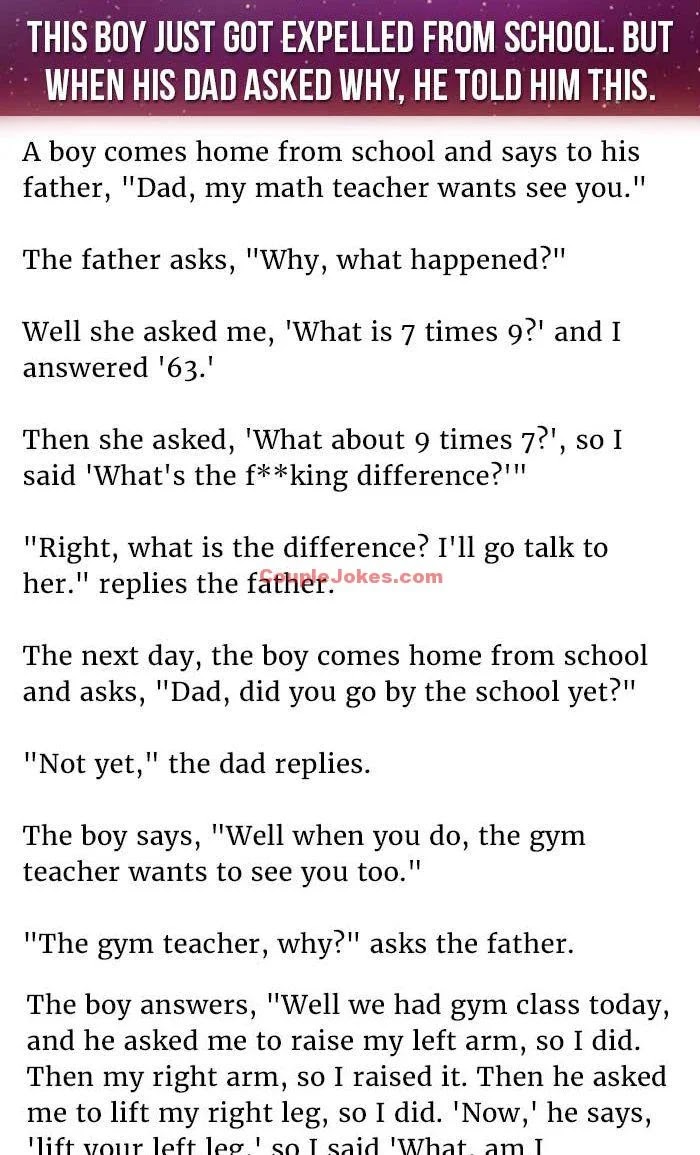 The boy explains, "Well we had a gym class today, and he asked me to raise my left arm, I did. Then my right arm, I also raised it. Then he asked me to lift my right leg, so I did. 'Now,' he says, 'lift your left leg,' so I asked 'What, am I suppose to stand on my cock!?'"